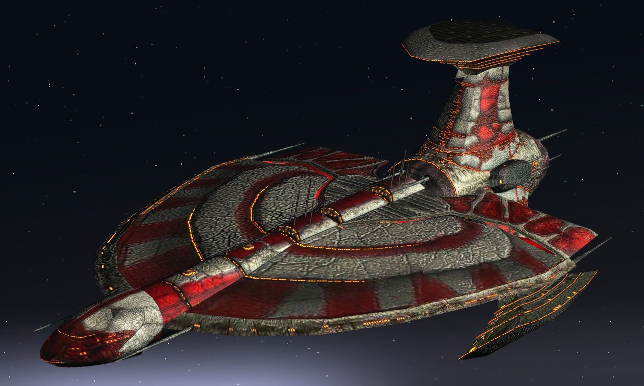 The Dhilani Trident is a Cruiser and Carrier in service to the Dhilani Empire. A mile in length it not only participates in ship-to-ship combat but is also used to punch through blockades or defense screens to deliver invasion forces, which it carries in a trio of Invasion Landers attached to its three arms.