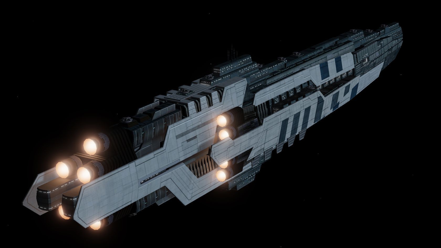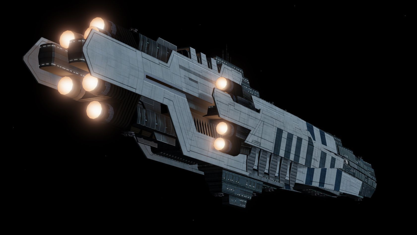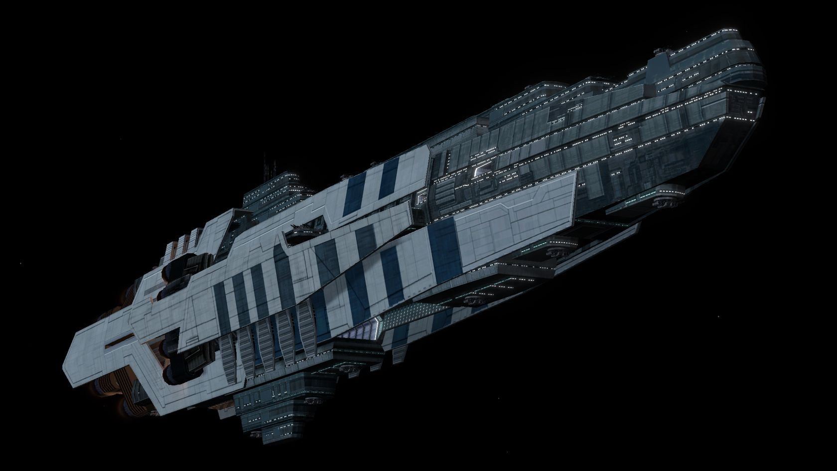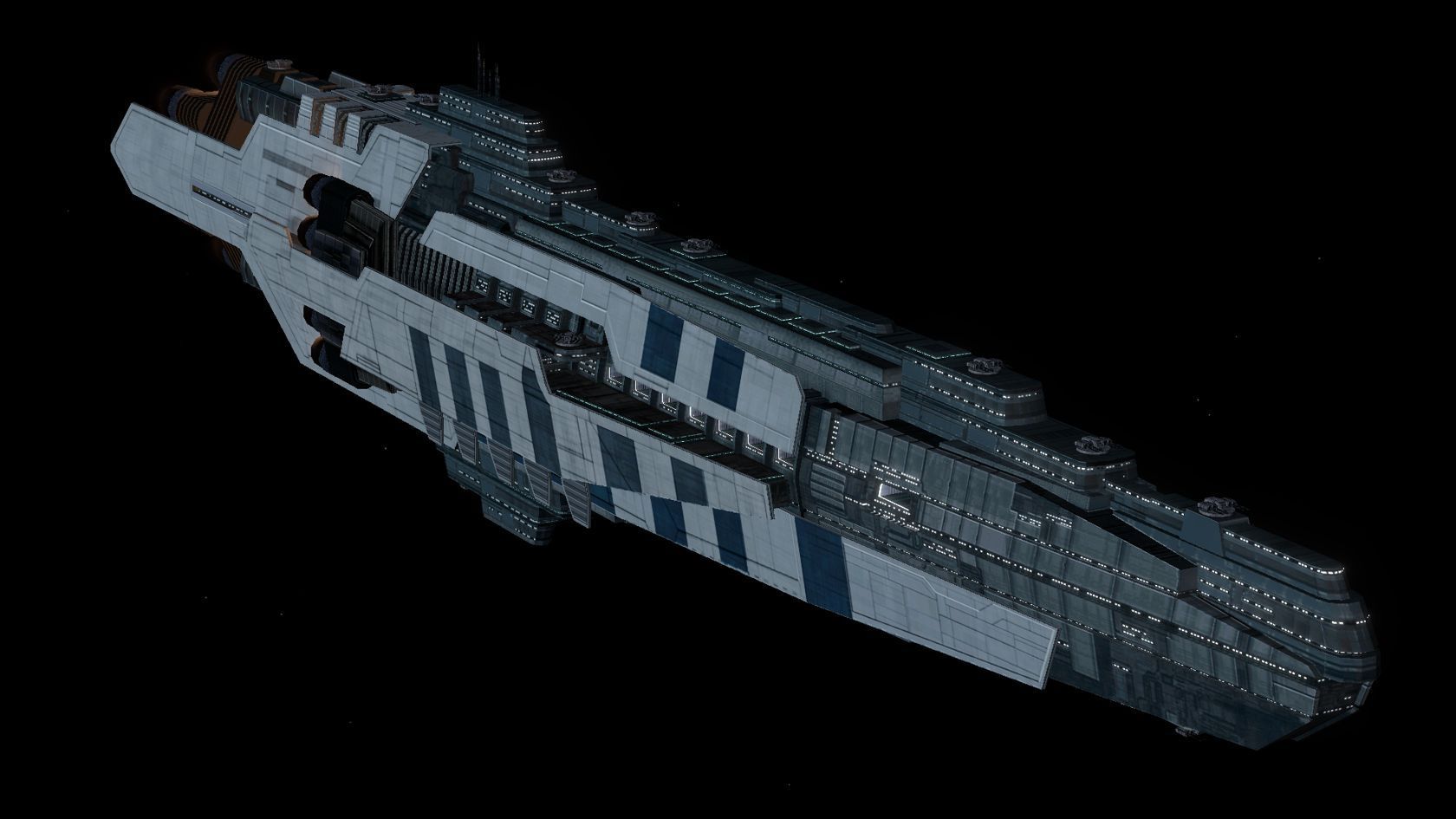In addition to its open main hangar bay which is large enough to hold ships up to corvette-class, the Titan possesses numerous smaller launch bays along its sides that allow for quick deployment of a large number of fighters, all at once.