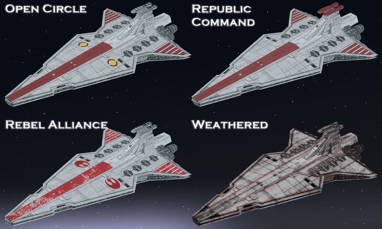 In previous versions, the Open Circle variant was the default option, with the generic republic or imperial versions being provided as FG colors. With version 1.3 I have made the unmarked version the default option and added any markings as separate skins. This reduces the filesize and also opens up several possibilities to mix and match, e.g. by combining weathered and Rebel Alliance skins.