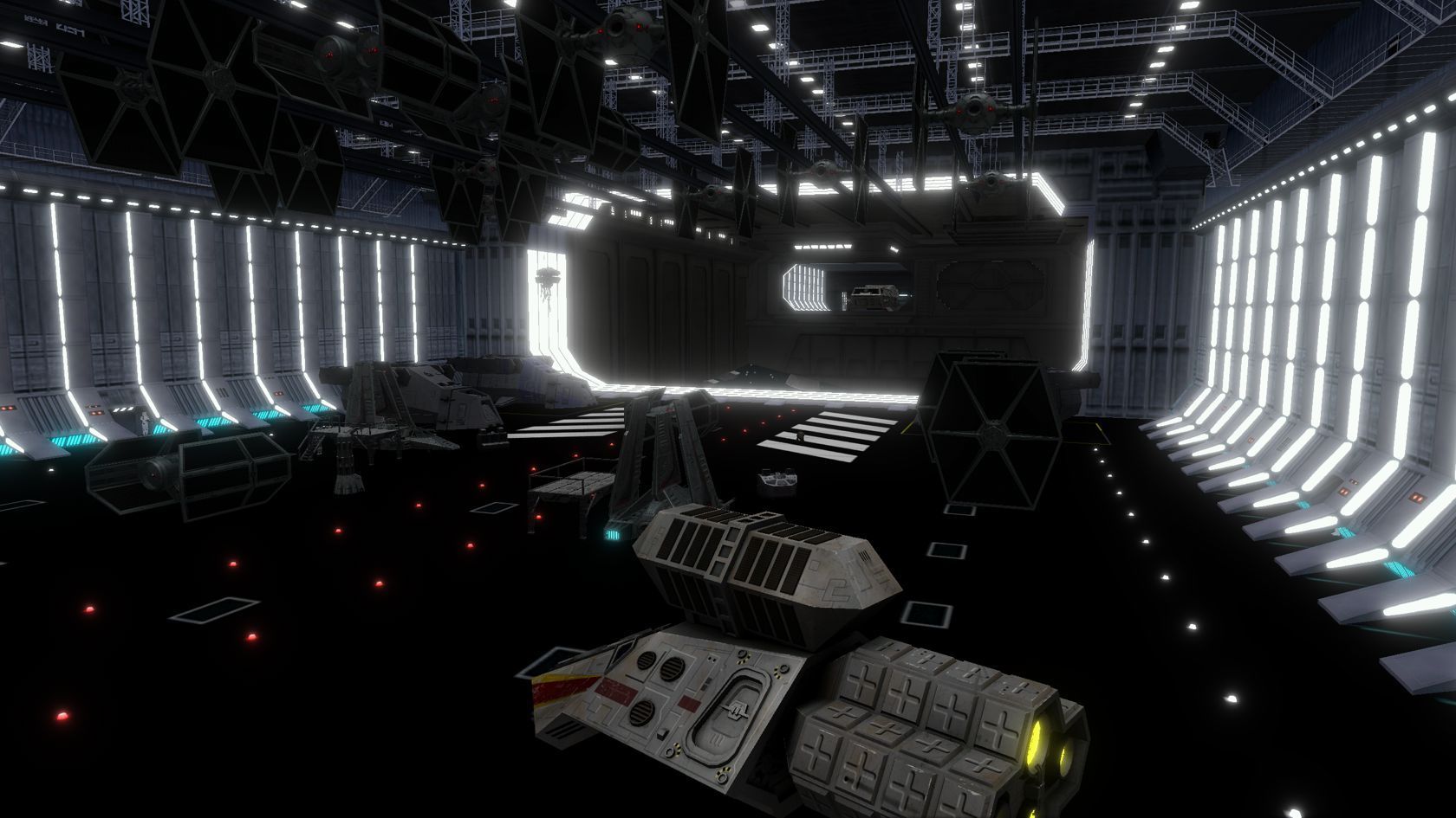 As of June 2022 I have completely redone the hangar model for VSD1 and 2. The new hangars are inspired by the upgraded ISD hangars. I have deliberately made them larger than life (Scale 1.5:1) for gameplay and accessibility reasons which generally allows for a less claustrophobic feel without being too ridiculously huge like my very first attempts on the Imperial hangar were.
