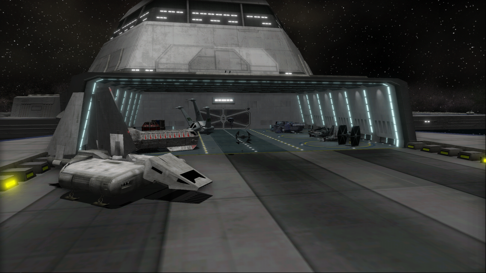 The platform includes a custom hangar OPT. Thanks to Ace Antilles this hangar has 3 different Setups depending on the station's IFF in custom missions: Rebel, Imperial, Neutral.
