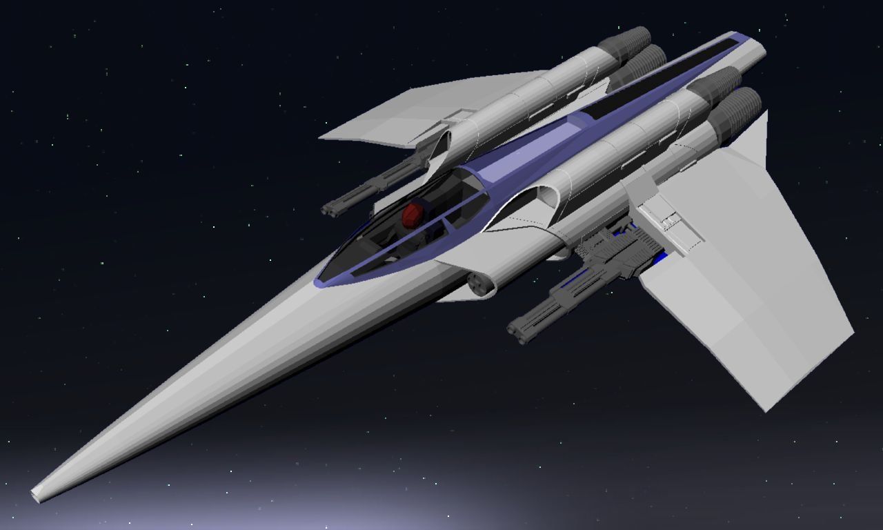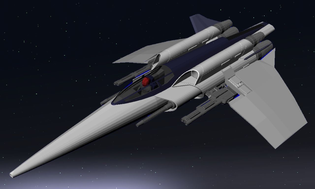 The original Victory Mk3 model had its wings pointing upward and the modified cannons attached to retractable flaps beneath them, which could fold inward to conceal these weapons. However I realized this made little sense as the cannons would clip into the ship's main thrusters and thus, realistically, find no place there. For the remake I have therefore moved them to replace the warhead launchers and thus make the ship slightly less overpowered.