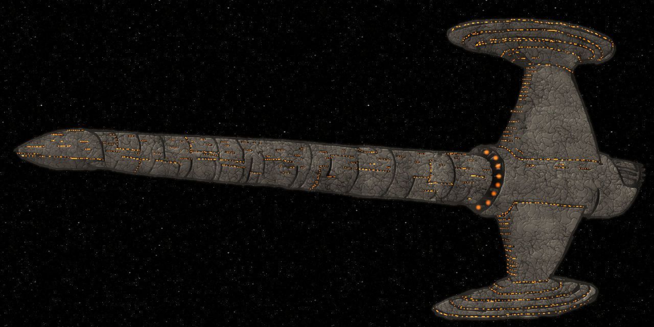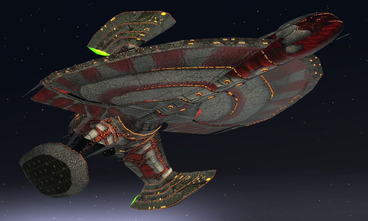 The Dhilani Trident is a Cruiser and Carrier in service to the Dhilani Empire. A mile in length it not only participates in ship-to-ship combat but is also used to punch through blockades or defense screens to deliver invasion forces, which it carries in a trio of Invasion Landers attached to its three arms.