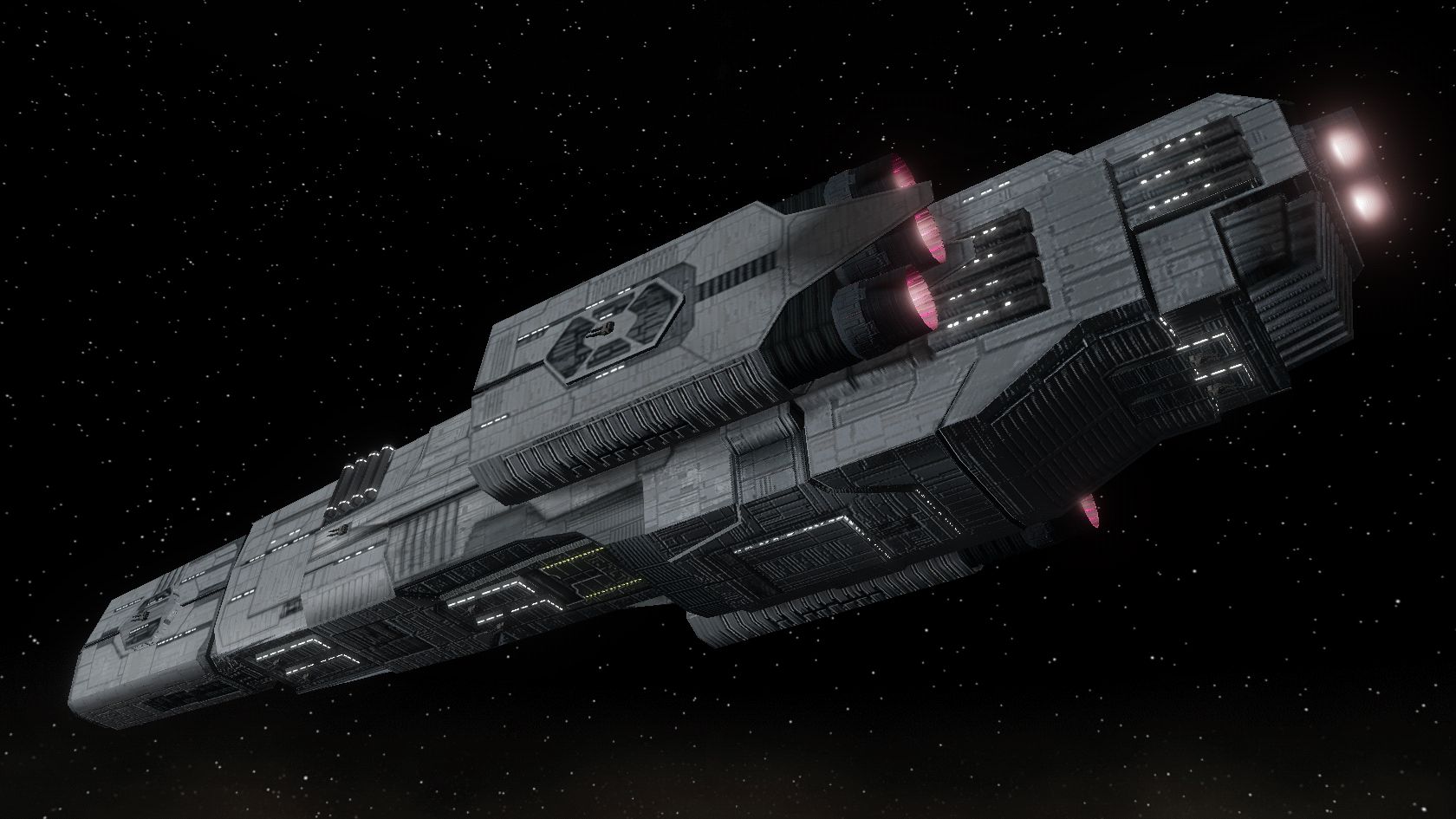 Unlike other carriers, the Praetorian carries mainly heavy weapons, designed designed for heavy combat against other capital ships. To compensate ship's spacious hangar and adjacend maintenance bay can support two full squadrons of starfighters for additional defense.