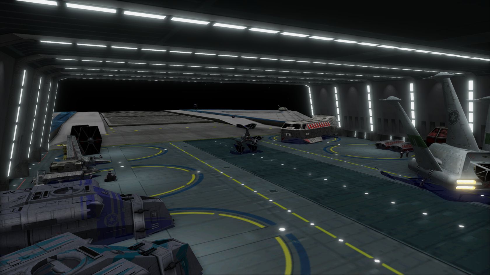 The platform includes a custom hangar OPT. Thanks to Ace Antilles this hangar has 3 different Setups depending on the station's IFF in custom missions: Rebel, Imperial, Neutral.